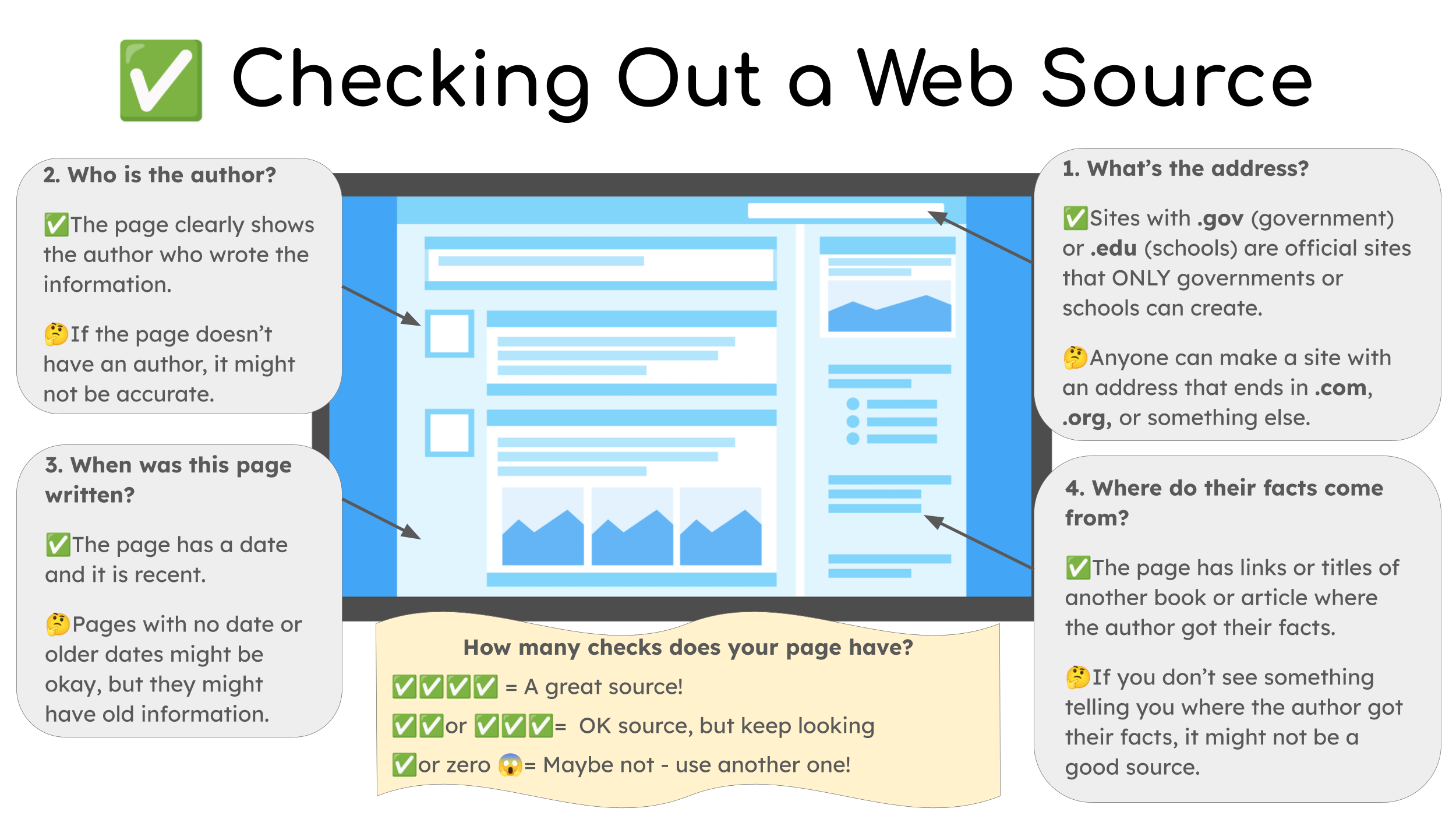 A friend of mine was looking for some tips for her middle school students on how to evaluate if a website was a good research source. I created a simple “anchor chart” (a large format image to help reinforce lessons) with four tips for judging the quality of a web source.